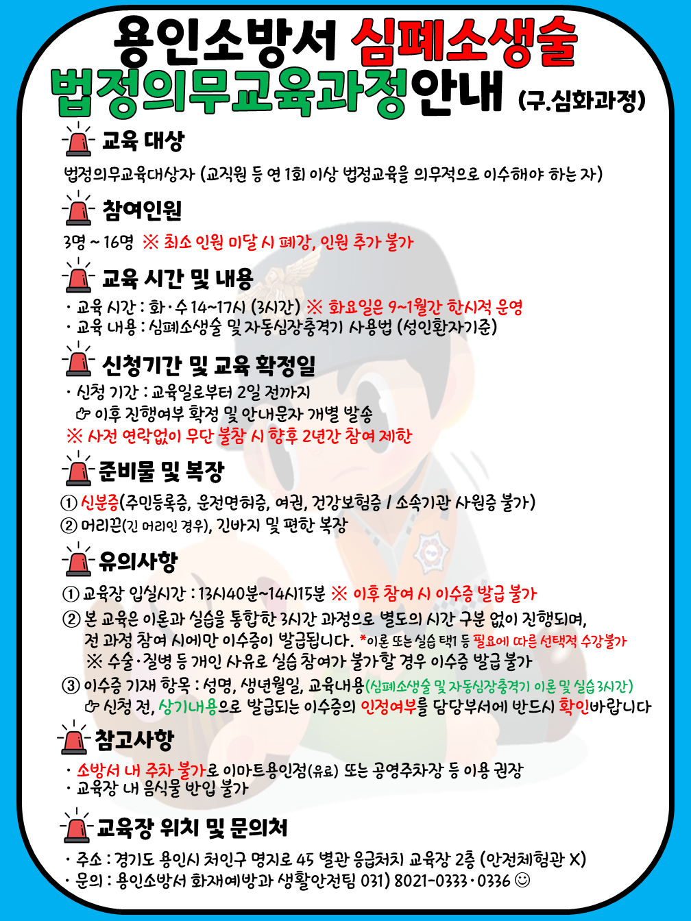 [CPR일반]심폐소생술 일반과정(2시간) 이용은 만족하셨나요?안녕하세요 2/23 27일 용인소방서에서 cpr교육 받은 LG유플러스입니다 윤하영 강사님께서 응급 상황 발생시 초기 대응 요령, 심폐소생술(CPR)방법, 자동심장충격기(AED) 교육을 열정적으로 해주신 덕분에 응급상황 발생시 대처요령은 물론 주저하지 않고 생명을 지키는 용기 를 얻을 수 있어 더욱 뜻깊은 시간이였다고 생각합니다 이번 교육에 함께해주신 용인소방서 윤하영 강사님께 다시 한번 감사의 인사를 드립니다.