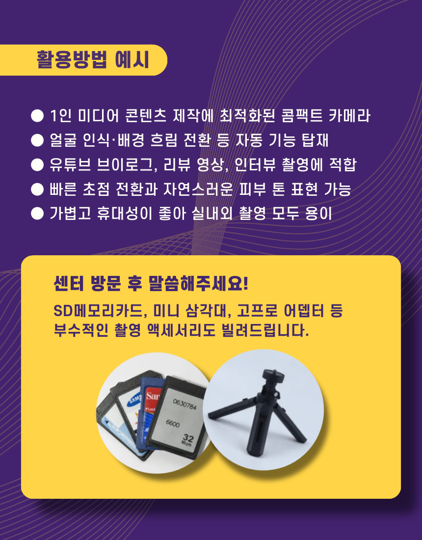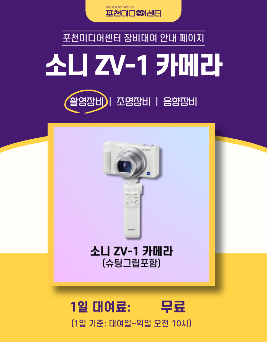 | 수령/반납장소 | 포천미디어센터 4층 장비대여실 | ||||||||||||||||||
